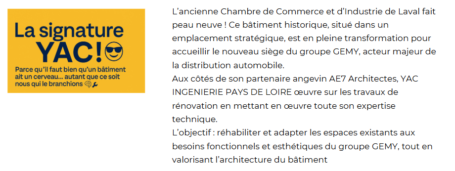 Un changement de propriétaire lié au nouveau projet de la CCI : cette dernière devrait déménager en mars 2025 dans l’un des nouveaux bâtiments du quartier gare pour former une Maison de l’entreprise avec la Région, Laval Mayenne aménagements et Laval économie.